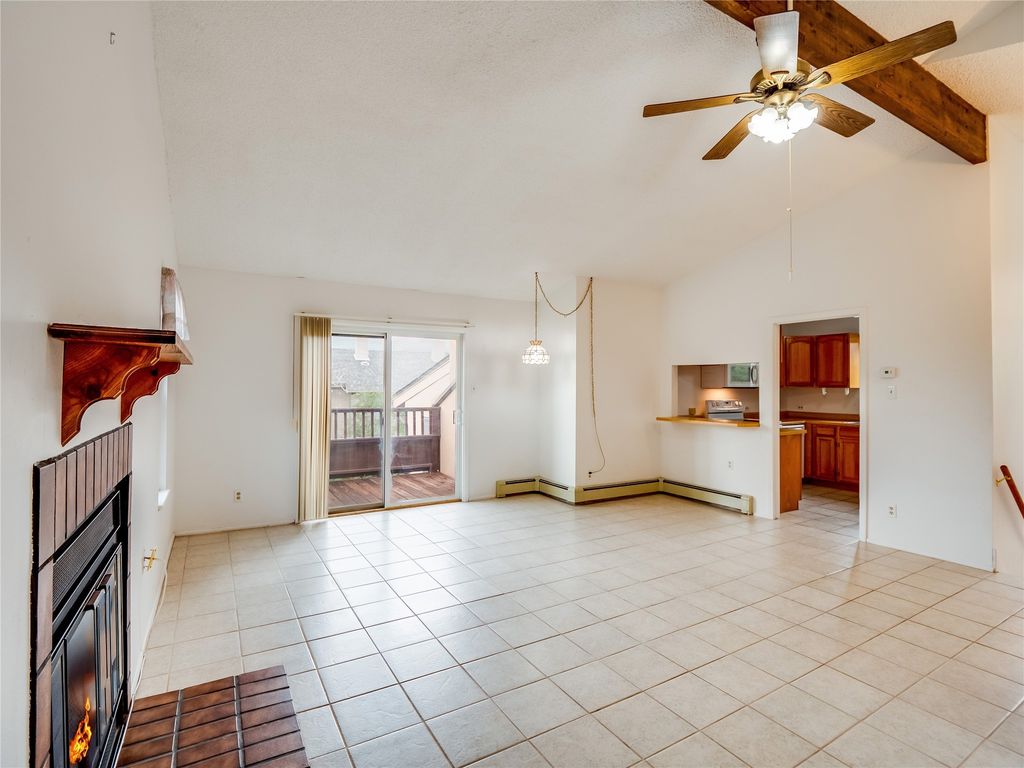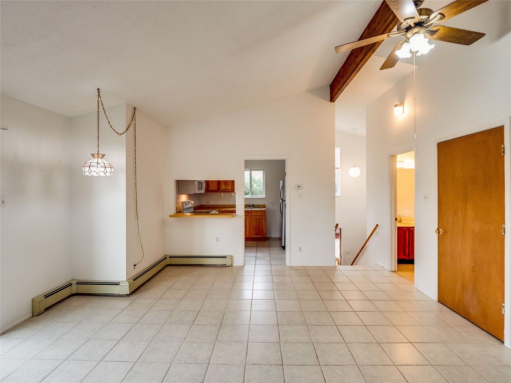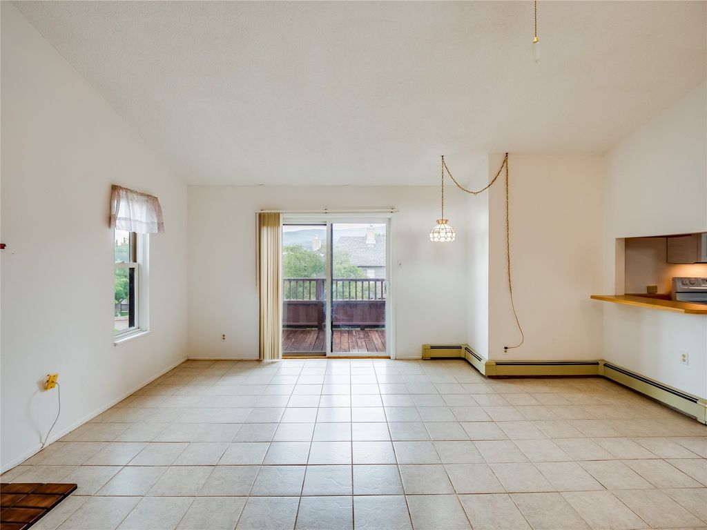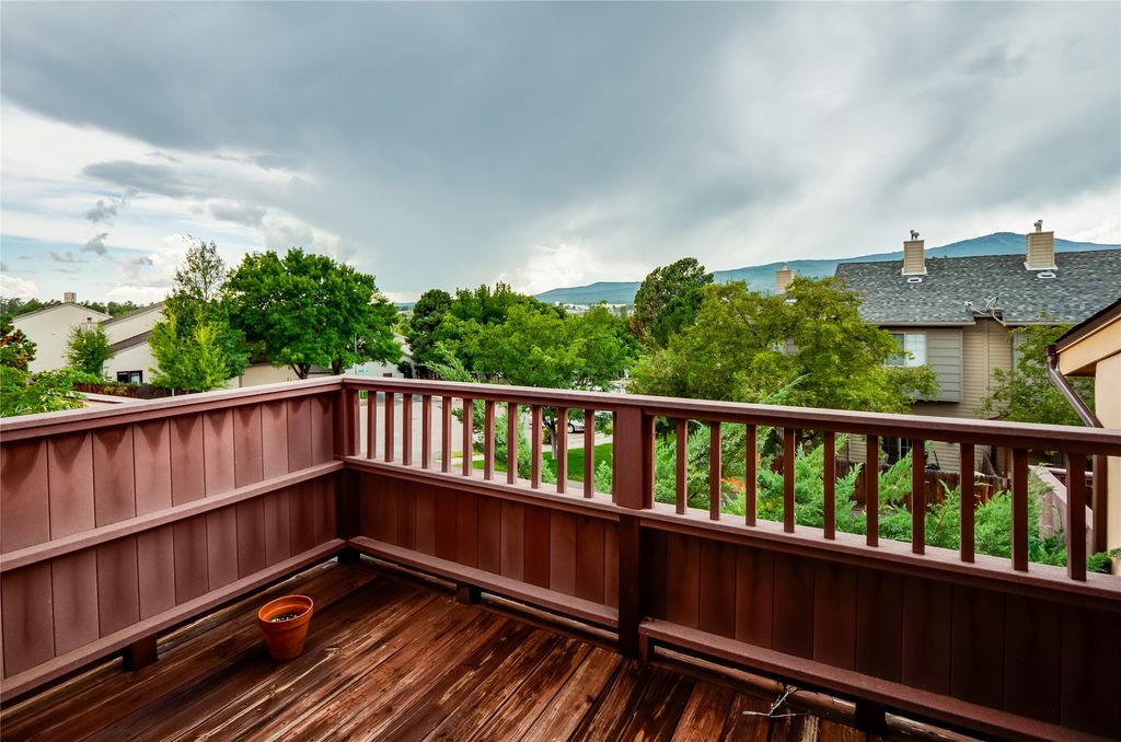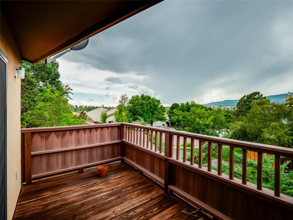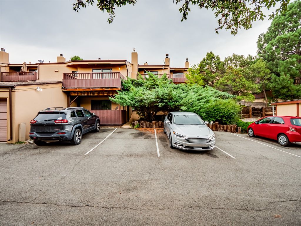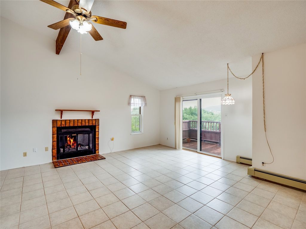 Welcome to this charming two-story condo located in the desirable Eastern area, offering comfort, functionality, and inviting spaces both indoors and out. Step through the front entrance and head upstairs to the main living level, where natural light fills the open-concept living and dining area. Vaulted ceilings and tile flooring create a bright, airy atmosphere, while the centerpiece wood-burning fireplace adds warmth and character. Sliding glass doors lead to a spacious wood deck with stunning mountain views - perfect for outdoor lounging, morning coffee, or summer BBQs. The kitchen is conveniently connected to the dining space, featuring wood cabinetry, a stainless steel refrigerator, a pantry, and a peninsula counter with a pass-through window for easy serving and conversation. Also on this level is a generous powder room, complete with a long vanity and single sink. Downstairs, brand-new plush carpet adds comfort throughout. This level includes a spacious guest bedroom and a private primary en-suite. The primary retreat boasts a large bedroom with double closets and access to a secluded deck - an ideal spot for unwinding at the end of the day. A shared full bathroom offers a tiled shower/tub and a single-sink vanity. For added convenience, a laundry closet with included washer and dryer, along with a deep storage closet, completes the lower level. This property also comes with a detached one-car garage, providing covered parking and extra storage space. Set in a quiet location close to parks, trails, shopping, and entertainment, this condo provides the perfect combination of peaceful living and everyday convenience. Don't miss the opportunity to make this inviting property yours - schedule a tour today!