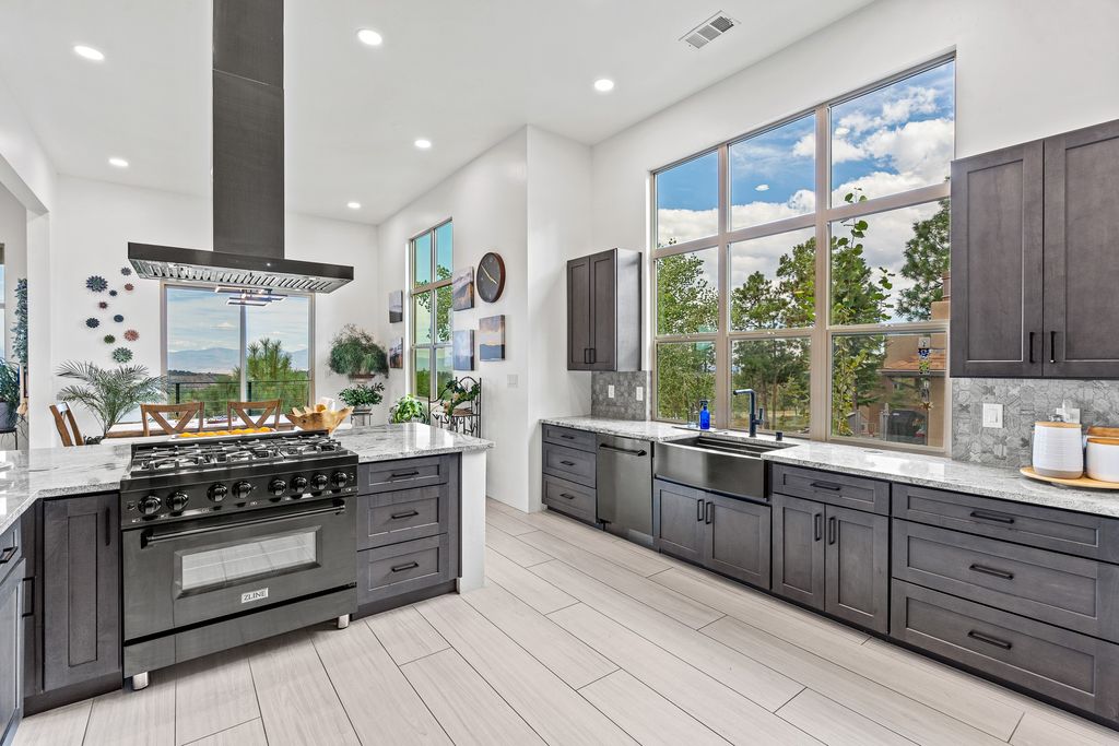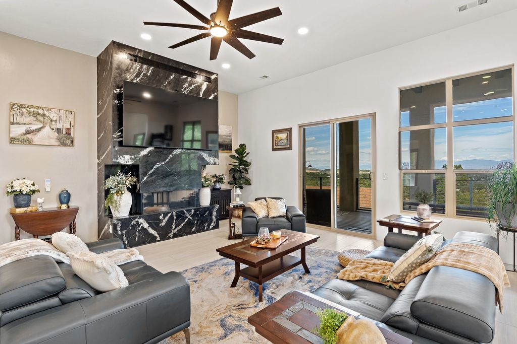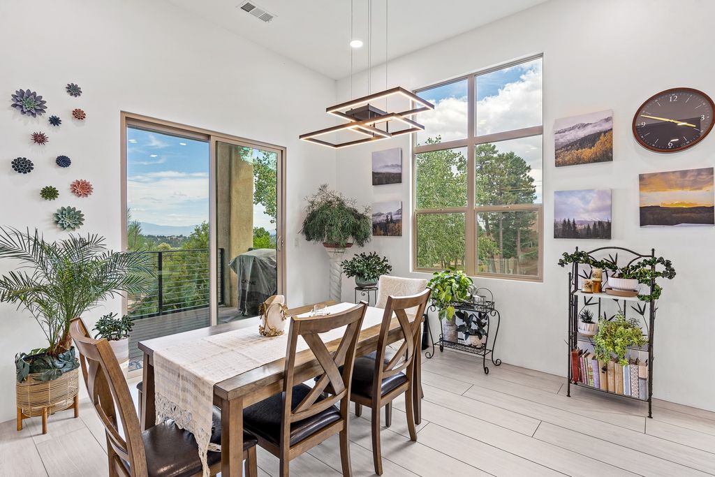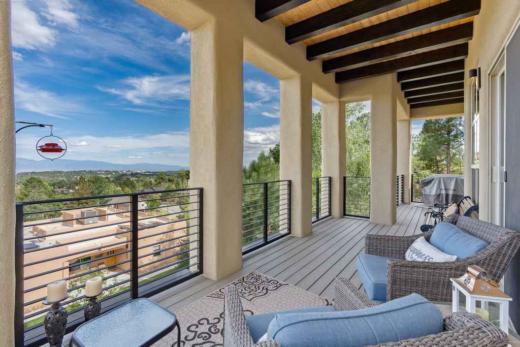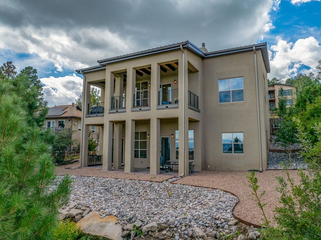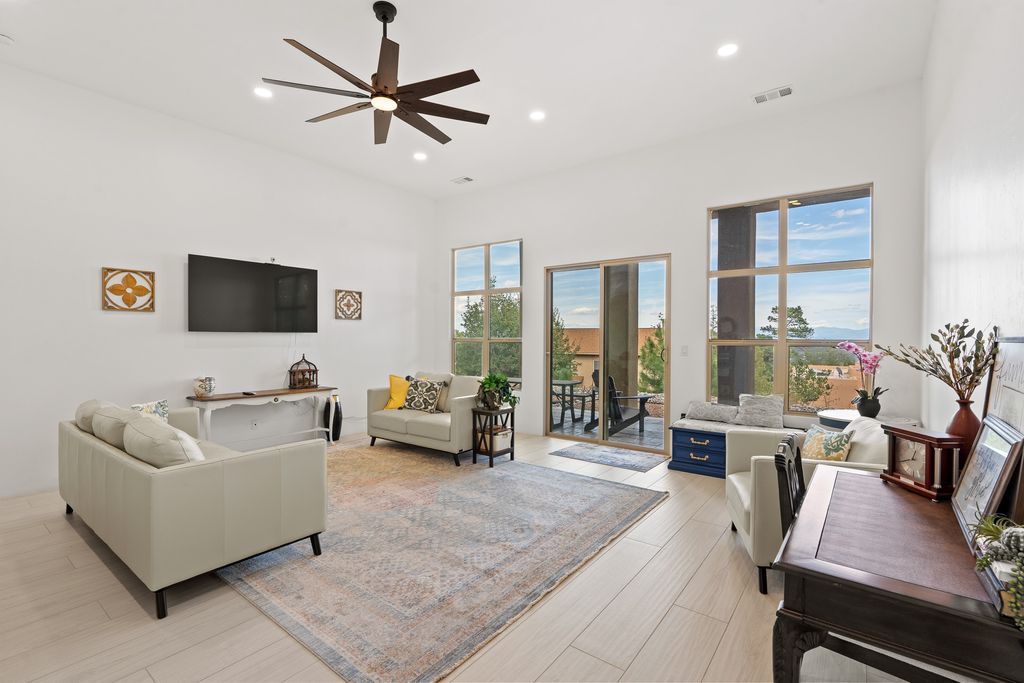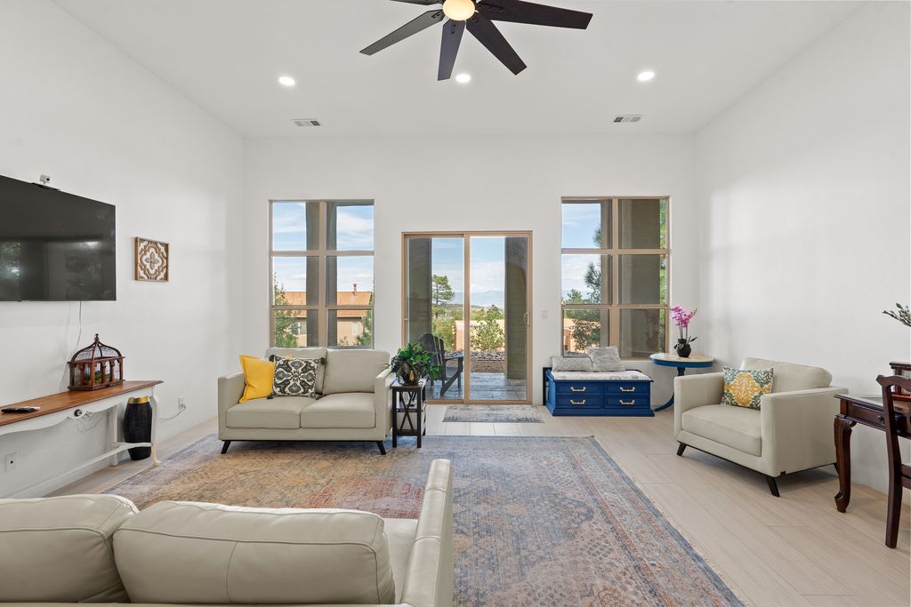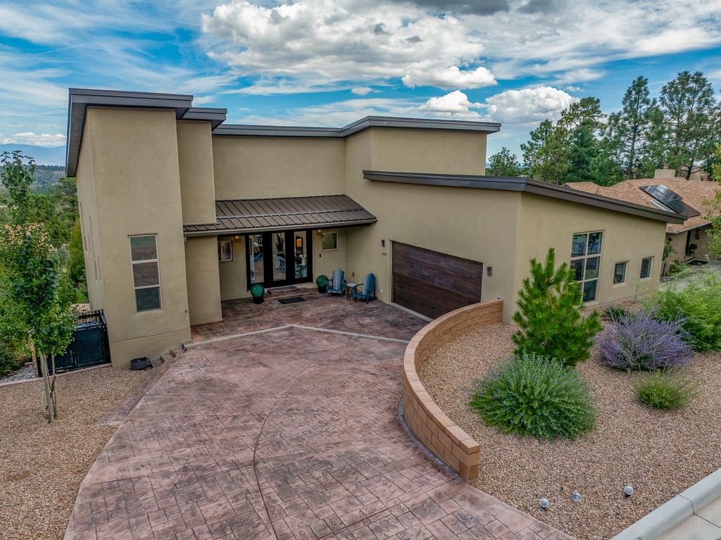 Unbelievable Views and Modern Luxury in Quemazon! Welcome to 1650 Sereno! This beautiful home was completed in 2023 and features 12 ft ceilings, 4 bedrooms, 3300+ sq ft of living space, Tesla Powerwalls (x2), solar panels, vehicle charger, a custom gas fireplace, radiant in-floor heating throughout, central air conditioning, a chef's kitchen, and more! As you enter the front door, the tall ceilings and views through the living room windows will captivate you and draw you inside, where you are free to explore the open floor plan of the main living space. Grab your favorite beverage from the chef's kitchen, and make your way onto the balcony to enjoy spectacular views of the Sangre de Cristo range to the east while looking straight down Los Alamos Canyon. The living room features a custom gas fireplace to keep you warm on those cool fall evenings and sliding glass doors to the covered balcony. The chef's kitchen includes ZLine appliances, granite counter tops, barstool seating, a farmhouse sink, and a wall of windows allowing the chef to enjoy natural light while preparing meals. The large primary suite is also on the main floor, allowing for single-level living. The primary suite includes a large bedroom, a walk-in closet, and an en-suit bathroom. The en-suite bathroom includes dual sinks, and a fully enclosed shower room includes a therapy tub for soaking after a day in the mountains. A bar and powder room round out the first floor of this home. Downstairs, you will find an additional living area with a walk-out patio area with a built-in outdoor kitchen for additional entertaining opportunities. Three additional bedrooms and a guest bathroom provide you with ample room to host guests. In-floor radiant heating will keep the home comfortable throughout the winter, and central air conditioning will keep you cool in the summer. Solar panels will lower your electric bills, and the Tesla smart Powerwalls will keep your home up and running when everyone else's lights go dark. The garage is also ready for your Tesla vehicles, with a charging station for both bays and custom cabinets for storage. The garage floor has been professionally finished with floor epoxy to provide you with a durable, protective, and attractive surface, enhancing its longevity and functionality with an easy-to-clean barrier. Dream homes like this rarely hit the market in Los Alamos, so schedule your showing today before you miss this one!