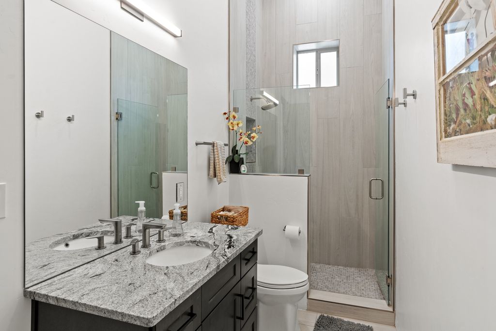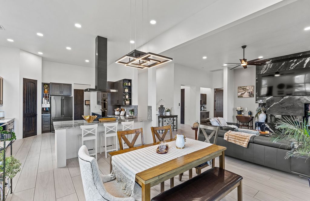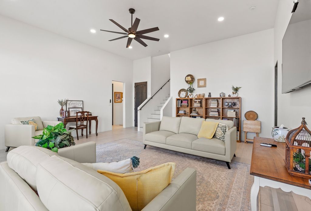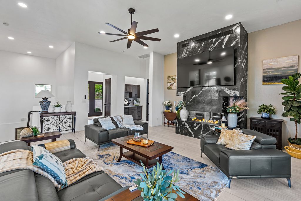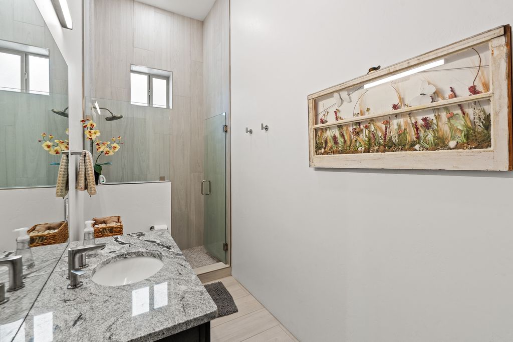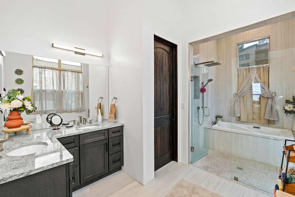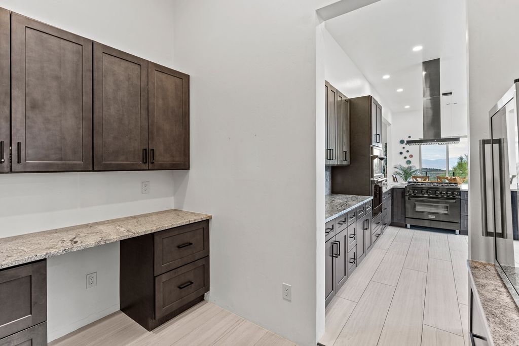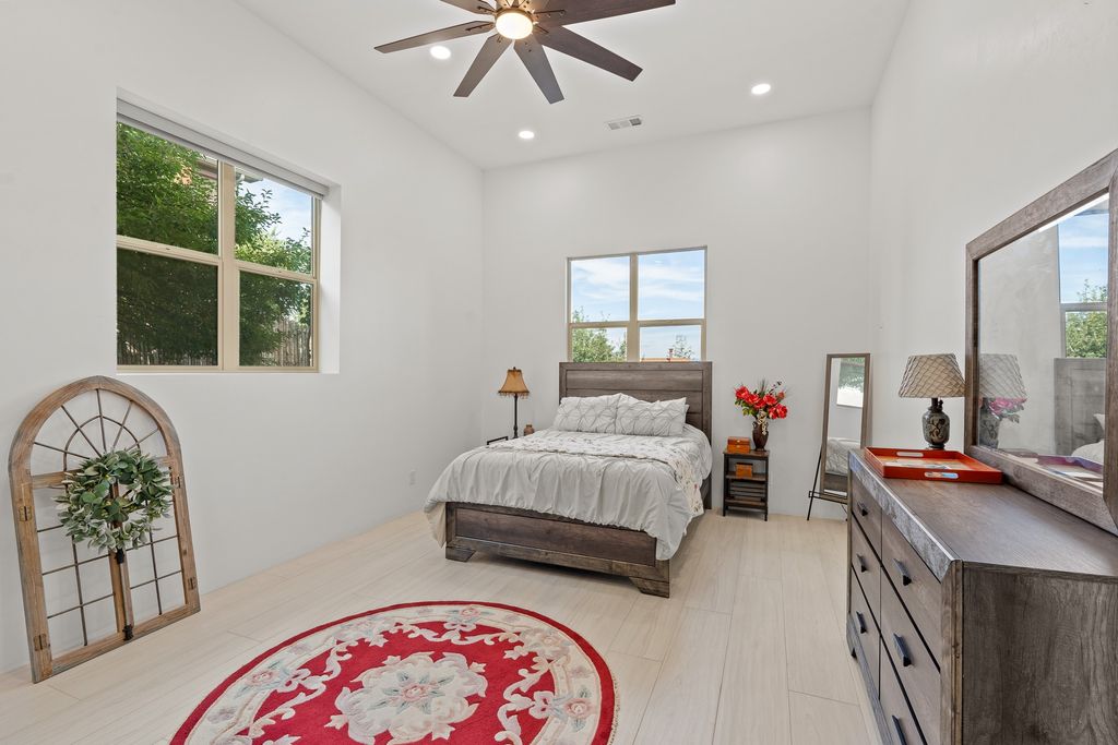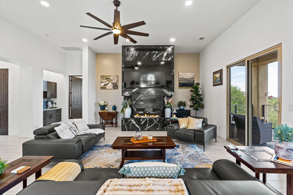 Unbelievable Views and Modern Luxury in Quemazon! Welcome to 1650 Sereno! This beautiful home was completed in 2023 and features 12 ft ceilings, 4 bedrooms, 3300+ sq ft of living space, Tesla Powerwalls (x2), solar panels, vehicle charger, a custom gas fireplace, radiant in-floor heating throughout, central air conditioning, a chef's kitchen, and more! As you enter the front door, the tall ceilings and views through the living room windows will captivate you and draw you inside, where you are free to explore the open floor plan of the main living space. Grab your favorite beverage from the chef's kitchen, and make your way onto the balcony to enjoy spectacular views of the Sangre de Cristo range to the east while looking straight down Los Alamos Canyon. The living room features a custom gas fireplace to keep you warm on those cool fall evenings and sliding glass doors to the covered balcony. The chef's kitchen includes ZLine appliances, granite counter tops, barstool seating, a farmhouse sink, and a wall of windows allowing the chef to enjoy natural light while preparing meals. The large primary suite is also on the main floor, allowing for single-level living. The primary suite includes a large bedroom, a walk-in closet, and an en-suit bathroom. The en-suite bathroom includes dual sinks, and a fully enclosed shower room includes a therapy tub for soaking after a day in the mountains. A bar and powder room round out the first floor of this home. Downstairs, you will find an additional living area with a walk-out patio area with a built-in outdoor kitchen for additional entertaining opportunities. Three additional bedrooms and a guest bathroom provide you with ample room to host guests. In-floor radiant heating will keep the home comfortable throughout the winter, and central air conditioning will keep you cool in the summer. Solar panels will lower your electric bills, and the Tesla smart Powerwalls will keep your home up and running when everyone else's lights go dark. The garage is also ready for your Tesla vehicles, with a charging station for both bays and custom cabinets for storage. The garage floor has been professionally finished with floor epoxy to provide you with a durable, protective, and attractive surface, enhancing its longevity and functionality with an easy-to-clean barrier. Dream homes like this rarely hit the market in Los Alamos, so schedule your showing today before you miss this one!